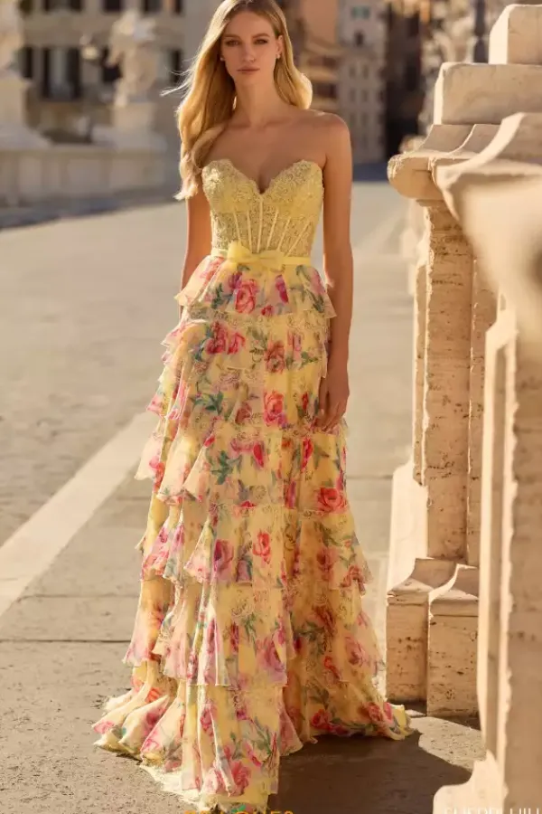 Brighten up the room in this vibrant yellow multi colored Sherri Hill sweep length prom dress style 57909. Yellow lace wraps around your bodice and displays a lace up adjustable closure on the back. The dainty bow belt hugs the small of your waist and highlights the top of the floral designed chiffon skirt.