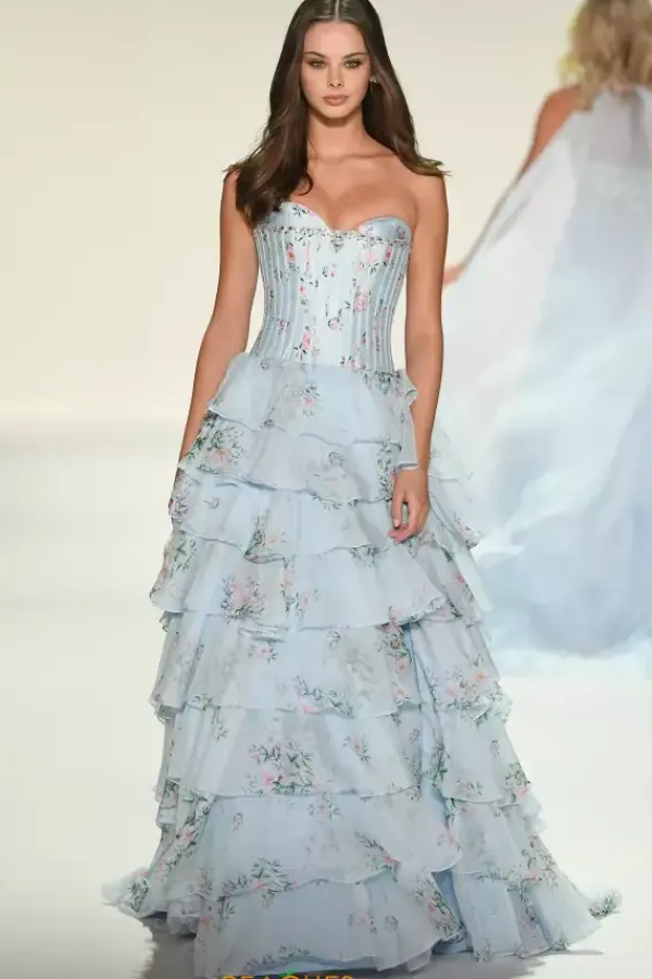If you are looking for pastels and floral prints, then this unforgettable Sherri Hill dress 57913 is for you! The strapless sweetheart neckline is met with a straight row of silver dainty beadwork on an elongated ultra boned corset bodice that cinches the small of your waist as the popular layered chiffon skirt flares out.