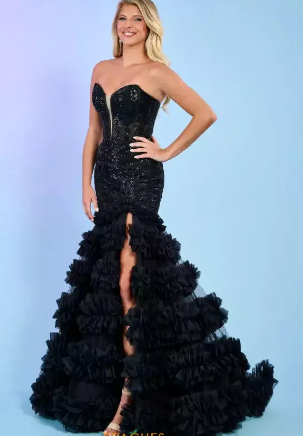 Make a grand entrance as you walk into your special event in this Rachel Allan long dress. This stunning mermaid silhouette 70543 showcases a lovely strapless neckline accompanied by a built in fitted corset bodice adorned with captivating beadwork. Flowing into a full multi layered ruffled tulle skirt this dress will have all eyes on you.