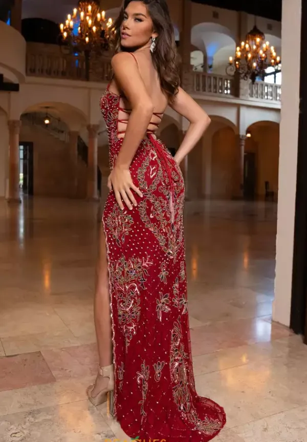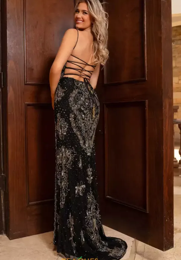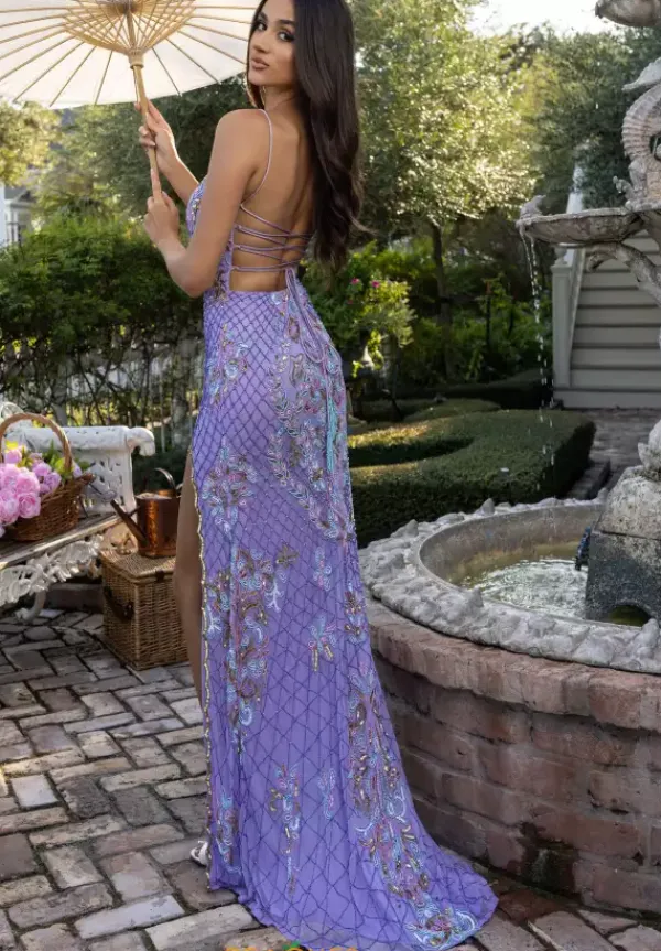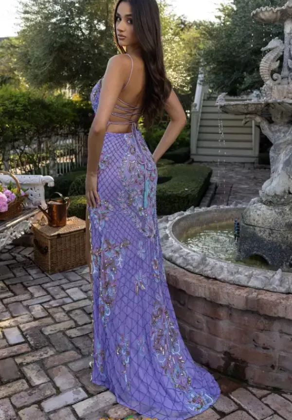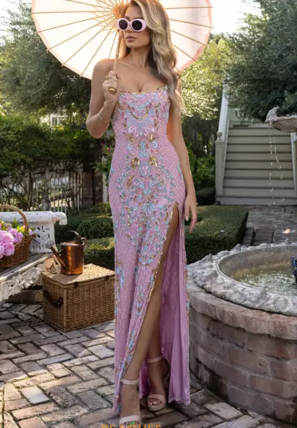 We are in love with is all over beaded Rachel Allan long dress style 70734. This boho chic beaded pattern is hand sewn. The scoop style neckline has thin shoulder straps that turn into an adjustable lace back with hanging fringe beading at the ends. The skirt has a thigh high side slit and a sweeping train.