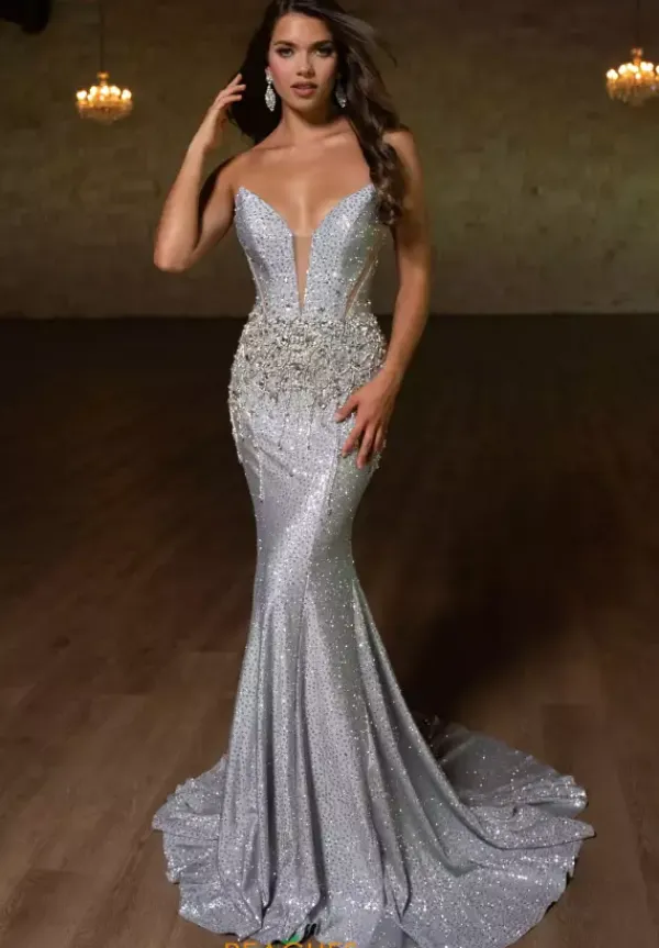 Make a lasting impression in this strapless dress from Rachel Allan 70742. The plunging v neckline has a sheer illusion insert with side bodice cutouts. The back is adjustable with a lace up corset. Glitter jersey material shimmers with amazing bead work that travels down the skirt from the small of your waist.