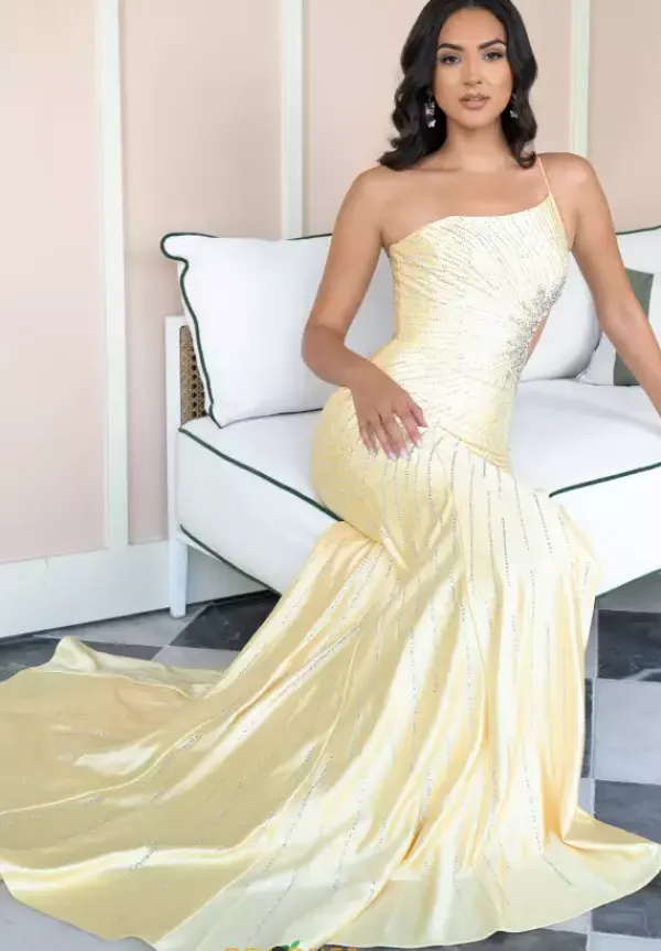 Be the most fascinating in this bright and flattering Rachel Allan prom dress style 70965. This sexy fitted style displays an asymmetrical single shoulder neckline along with a dramatic midriff cutout that accentuates a single side of your waist for a flattering effect. Glimmering beads trace the outline of the cutout and scatter into sparkling rows throughout the dress.