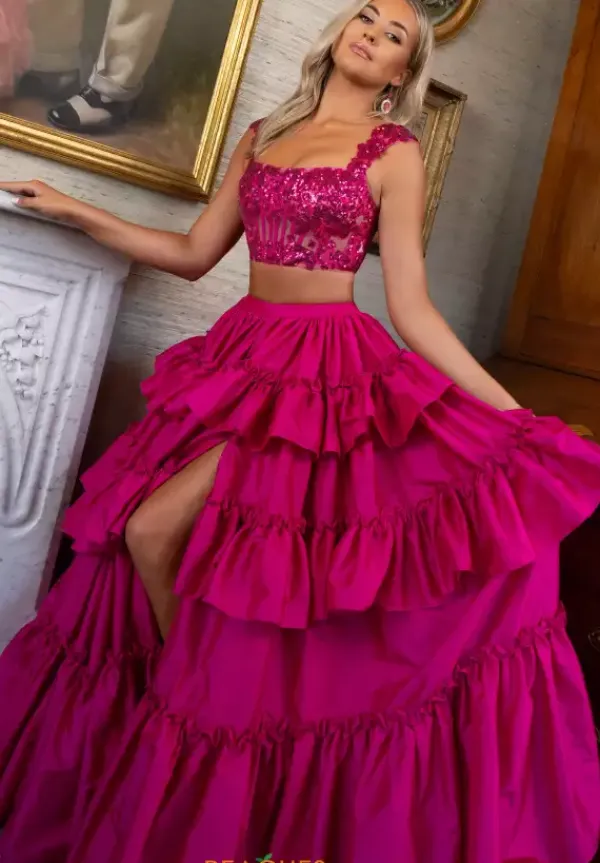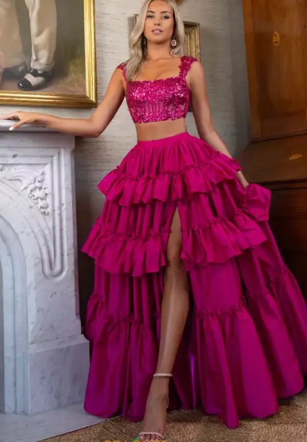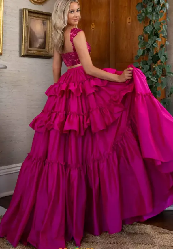 Glisten and glow this prom season in this haute two piece dress by Rachel Allan style 70966. The cropped fitted bodice and sleeves are adorned in luminous sequin beaded appliques that match the color of the lavish voluminous taffeta tiered floor length skirt where a fierce thigh high slit is featured as the finishing touch.