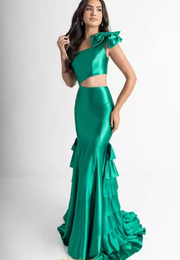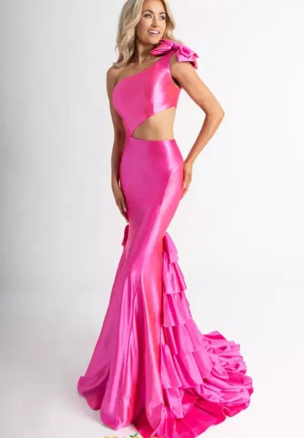 Sleek sophistication exudes when you wear this sensational stretch satin Rachel Allan long dress style 70976 to your next social occasion. This striking gown showcases a fitted bodice with an asymmetrical neckline, side cut out and single shoulder strap with bow. The long straight skirt has tiered ruffle details in the back that fall into a sweeping back train.