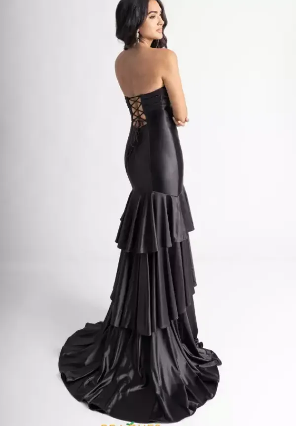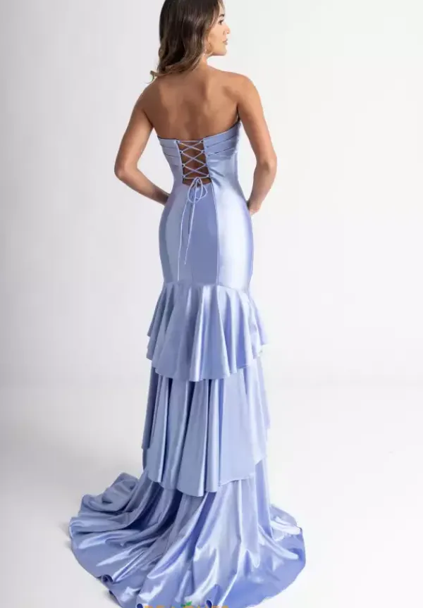 Dance the night away wearing beautiful long fitted dress by Rachel Allan, style 70987. Featuring a ravishing strapless sweetheart neckline with a rose in the middle paired with a high thigh slit and a ruffled bottom skirt. Made entirely from satin material with a corset lace up to shape your waist beautifully.