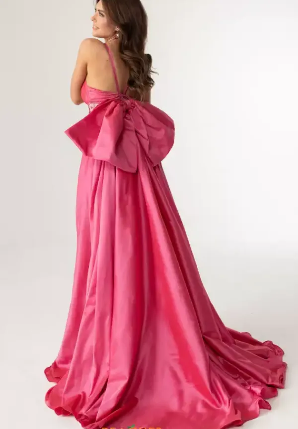 Look red carpet ready in this ultra glamorous Rachel Allan dress style 71016 made in a nude stretch tulle accented with deep pink beading throughout. This impeccable gown showcases a fitted bodice with a V neckline, spaghetti straps and zipper back. The long slender skirt has a side slit and removable taffeta overskirt with a big bow draping into a sweeping train.