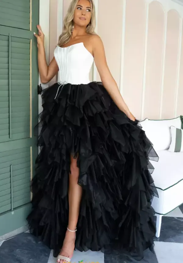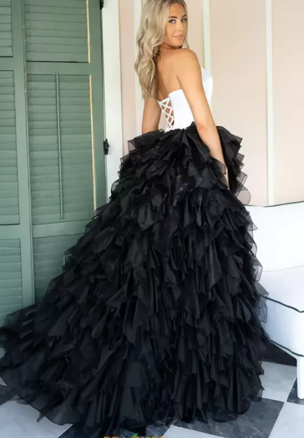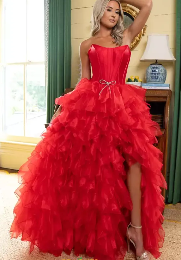Look like a modern day princess at prom in this sensational Rachel Allan ball gown style 71018 made in a combo of crystal satin and shimmering organza fabrics. This phenomenal gown showcases a strapless corset bodice with visible boning, silver bow at waist and lace up tie back. The, a line, long full skirt has ruffle, tiered organza layers with a front slit.