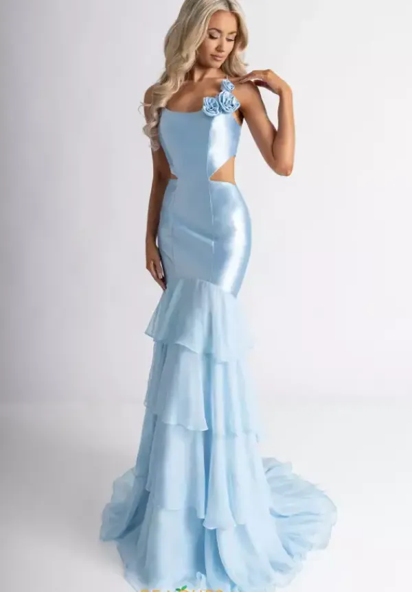 Look totally chic at prom in this astonishing Rachel Allan long dress style 71027 made in a combination of stretch satin and flowing chiffon fabrics. This impeccable gown features a fitted long bodice with side cut outs, spaghetti straps, 3D flowers on one shoulder and lace up tie open back. The long skirt is made of tier ruffle chiffon layers that fall into a sweep train.