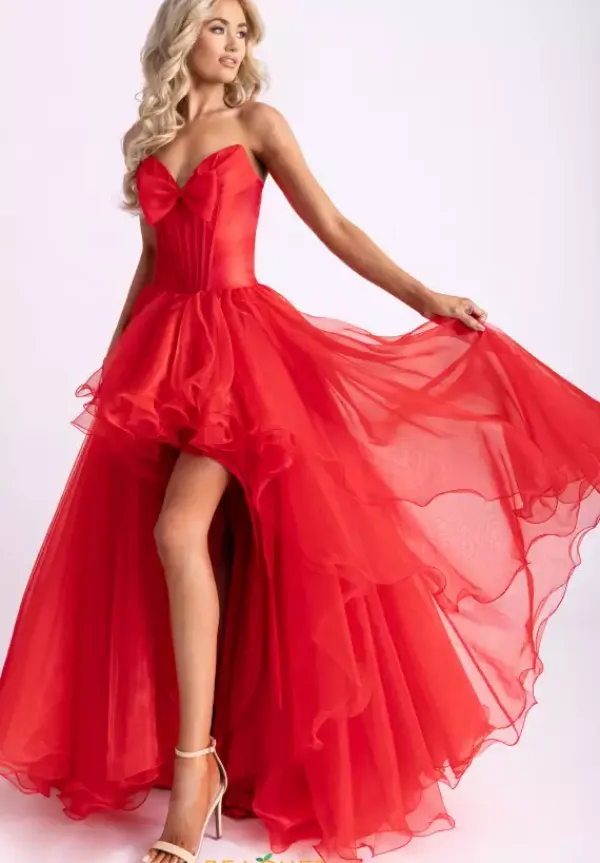We are in love with this refined Rachel Allan high low dress style 71046. This striking combination of silky satin and organza boasts a flattering fitted corset bodice and a flared organza skirt with a short front that cascades into a long sweep train on the back. The strapless neckline has a bow embellishment.