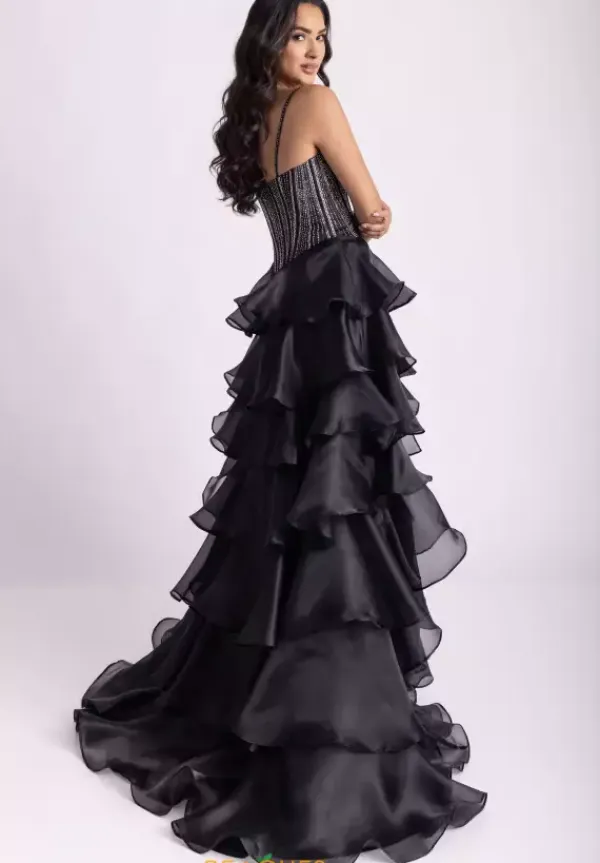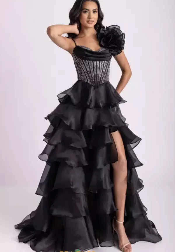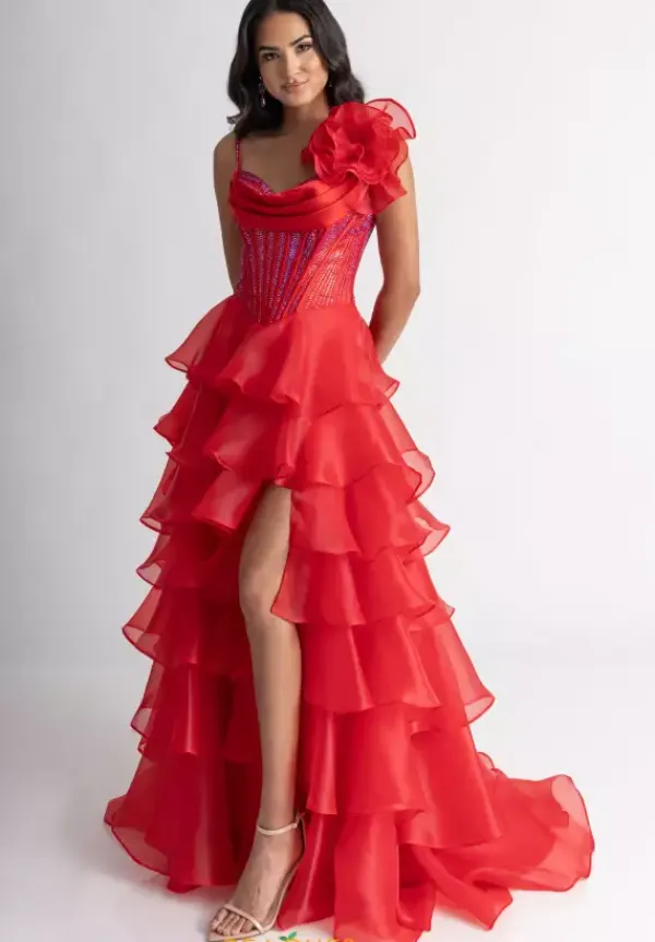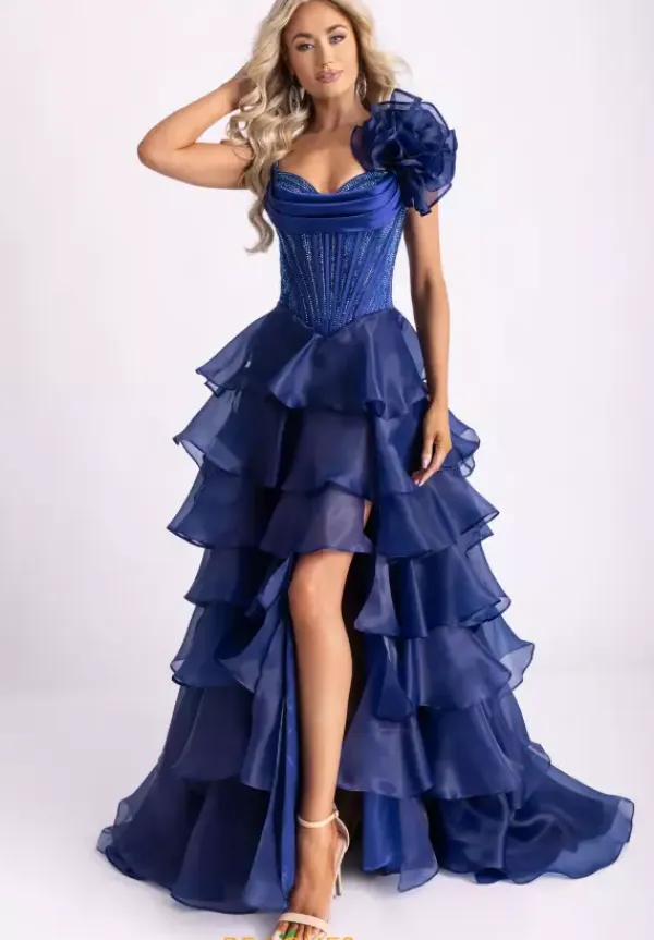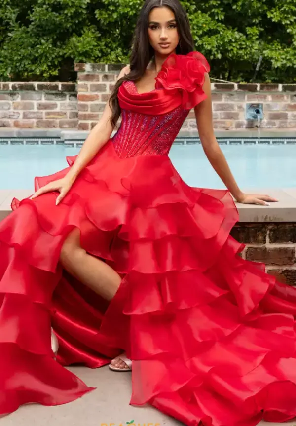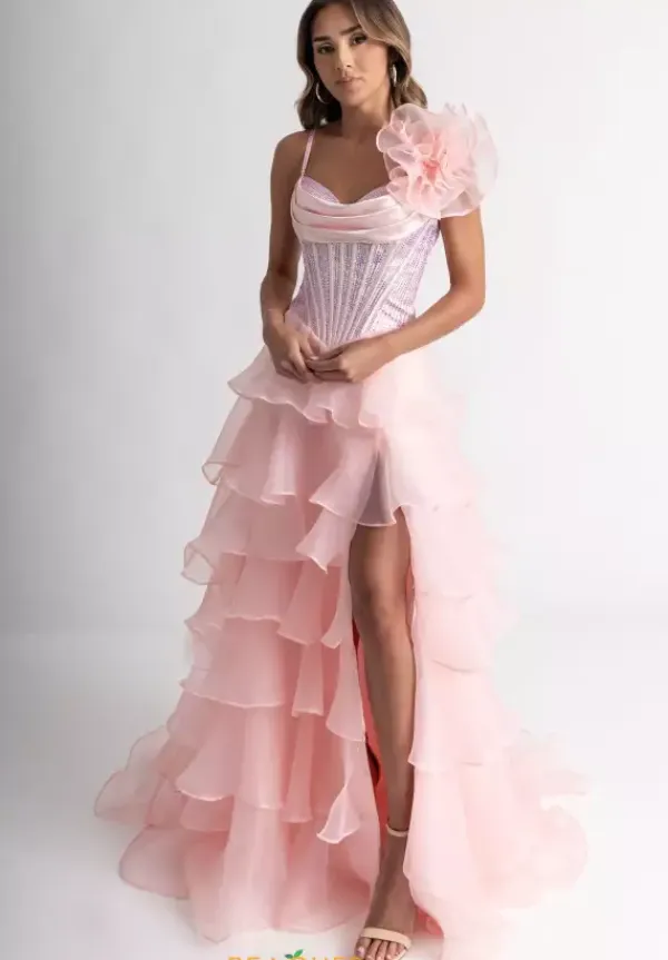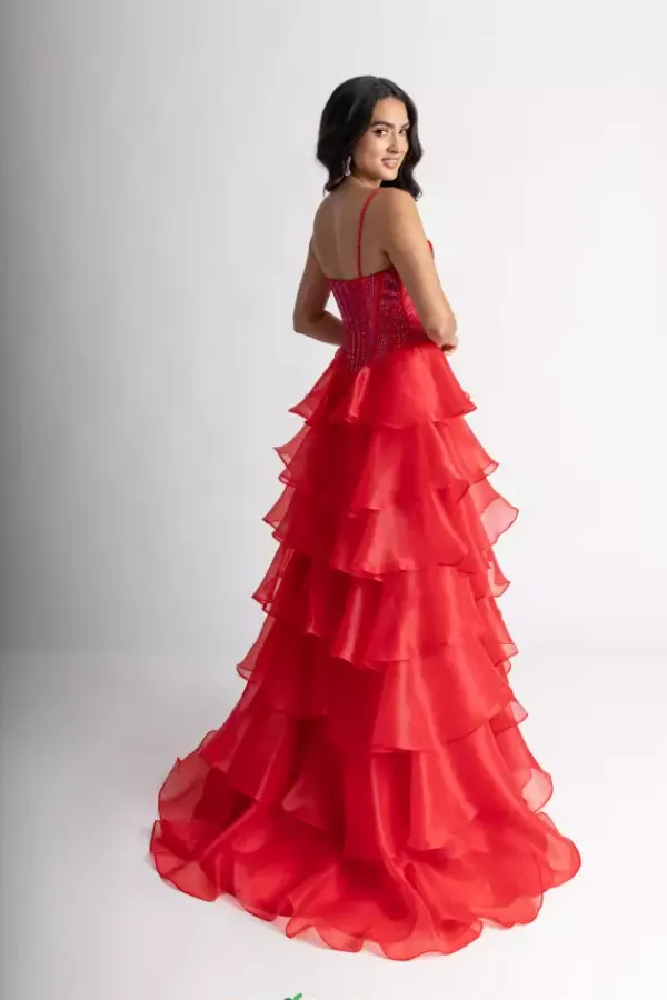 Look like you stepped out of a fashion show when you wear this alluring A line dress style 71049 designed by Rachel Allan. This zipper dress has a pleated scoop corset bodice dazzling with vivid rhinestones to sparkle radiantly with the frilly organza a-line skirt that cascades into the classic sweep train.