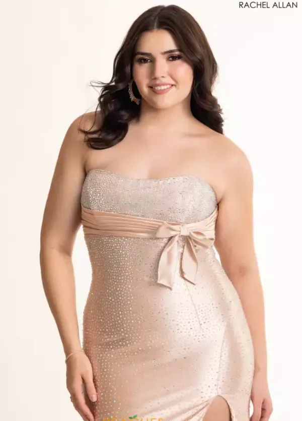 Show off your figure in this sleek fitted Rachel Allan long dress 71067. The strapless scoop neckline is met with an empire ruched belt with a bow. The dress is sparkling head to toe in hot set rhinestone beading and the skirt has a front thigh high slit and sweeping train. The stretch satin material hugs to your frame.