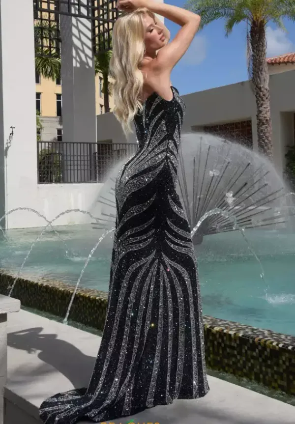 Own it all in this vivacious red carpet ready Jasz Couture prom dress style 7941. The plunged fitted bodice is perfectly highlighted by shimmering shape contouring sequin patterns that are in a downwards pointed direction down to the fierce thigh high slit and show stopping sequin patterned sweep train.