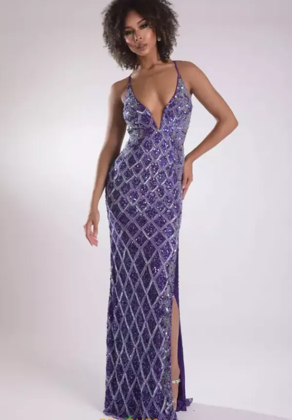 Make the statement of the season wearing eye catching long dress style 7953. Alluring low v neckline is paired with a sexy open back detailed with crisscrossed straps along the upper back. Unique floral pattern decorates down the sides and repeats along the center of the back and cascades down the train. of the gown. Displaying diamond like sequin to have you glistening effortlessly all night long.