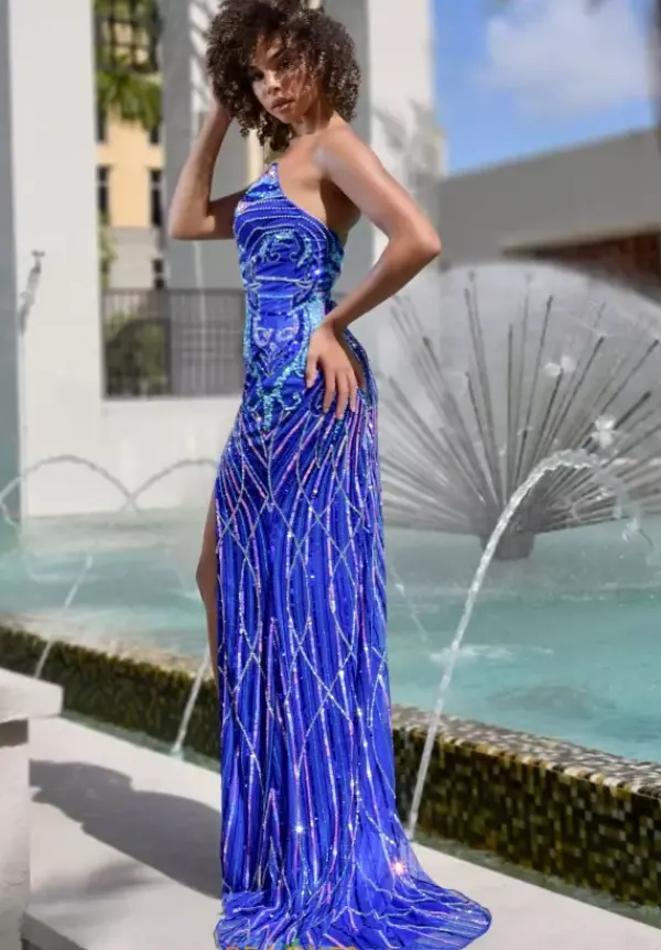 Glisten perfectly in the sun wearing remarkable long dress style 7958 by Jasz Couture. The strapless pointed neckline is gorgeously paired with a fitted bodice beautifully embellished with heavy unique sequin beading. Cascading down the fitted skirt are intricate lines of sequin which extend down to the fly away train.
