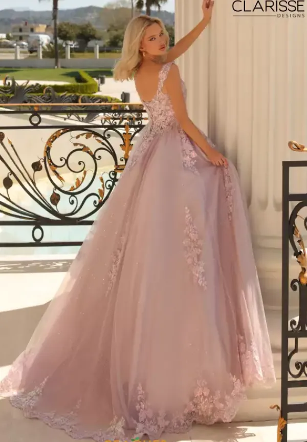 Live your modern day princess dream in this enchanting long dress by Clarisse, style 810888. Featuring an A-line silhouette with a scoop neckline that has two delicate straps that lead to a lace up back. The corset bodice is a adorned with gorgeous applique that cascades down the dress. The glittered tulle skirt is sure to have you sparkling all night long.