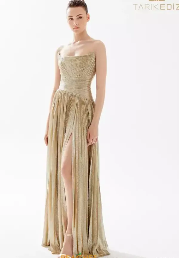 All eyes will be on you when you enter your special event in this fabulous Tarik Ediz dress 98200. Made from a novelty jersey metallic material this scoop style neckline has a structured bodice in a ruche crisscross pattern. The pleated a line skirt has a front slit which makes it easy to dance the night away in.