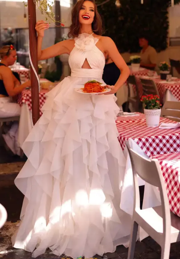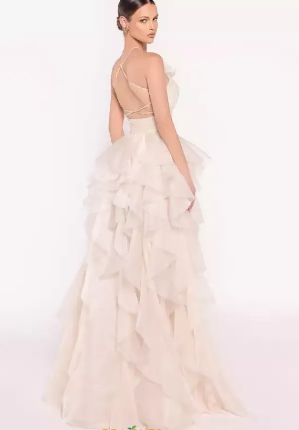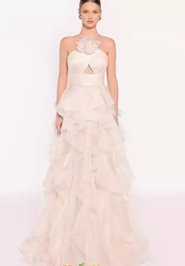 Feel like a princess in this a line Tarik Ediz dress style 98818/ This high halter neckline dress showcases a rosette style flower with a key hole opening above the belted waist line. The vertical ruffles flow from the small of your waist giving you the perfect a line shaped skirt. The back is completes with an adjustable lace up.