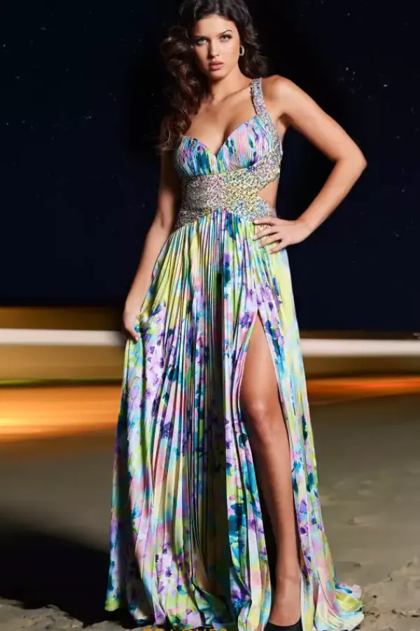 Be bold and get noticed at prom in this eye catching floral print Jovani long dress style 38733. This impeccable gown features a fitted bodice with a pleated bust, beaded midriff with side cut outs and beaded straps that crisscross over the open back. The lovely long, a line skirt is pleated and flowing with front, side slit and sweep train.