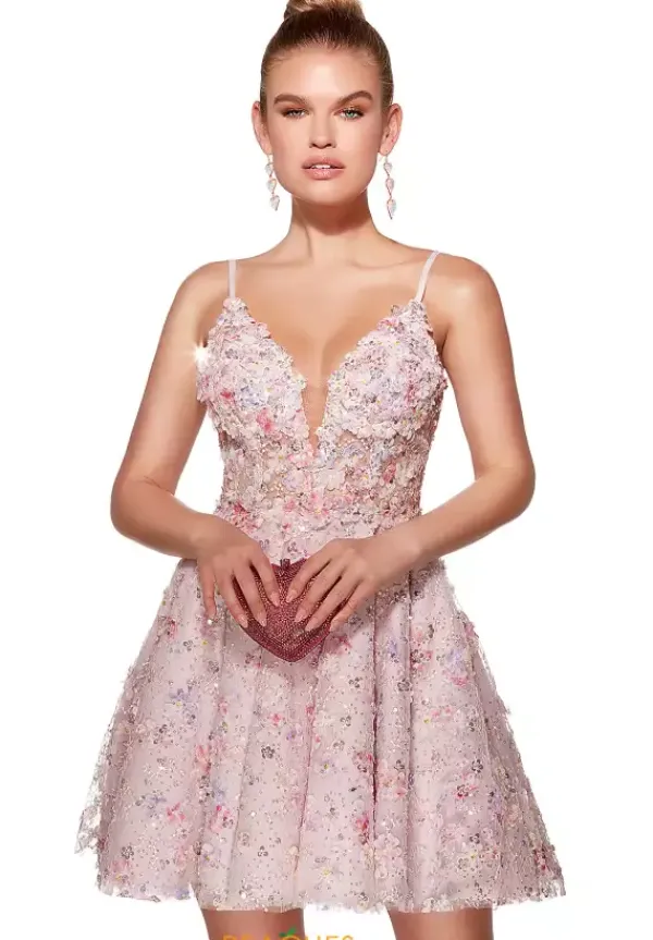 Try something new and wear this Alyce Paris dress to your next event! Style 30017 features a ravishing V neckline paired with adjustable straps that leads to captivating open back. You’ll love how this corset accentuates the charming A line silhouette. Adorned with gorgeous applique and dazzling sequins all overt the dress, the corset includes mesh on the bodice for a one of kind look.