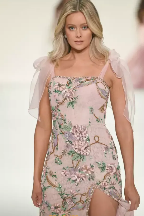 Enchant the crowd in this floral Sherri Hill pageant dress style 57602. This timeless fitted silhouette includes a thigh high slit and sweep train on the glistening sequin beaded long skirt while soft tulle bows decorate the straps of the scoop neckline. Floral beaded patterns are featured throughout the entire dress for impeccable detail and radiance.
