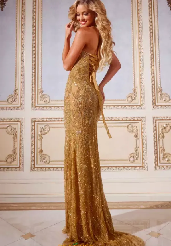 Look and feel ready to attend the met gala in this stunning gown by Jovani style D5983. Featuring a classy v cut neckline supported by beaded spaghetti straps that create an open lace up back for the perfect amount of support and comfort. This fitted silhouette is made entirely from a stunning beadwork to have you shimmering all night long.
