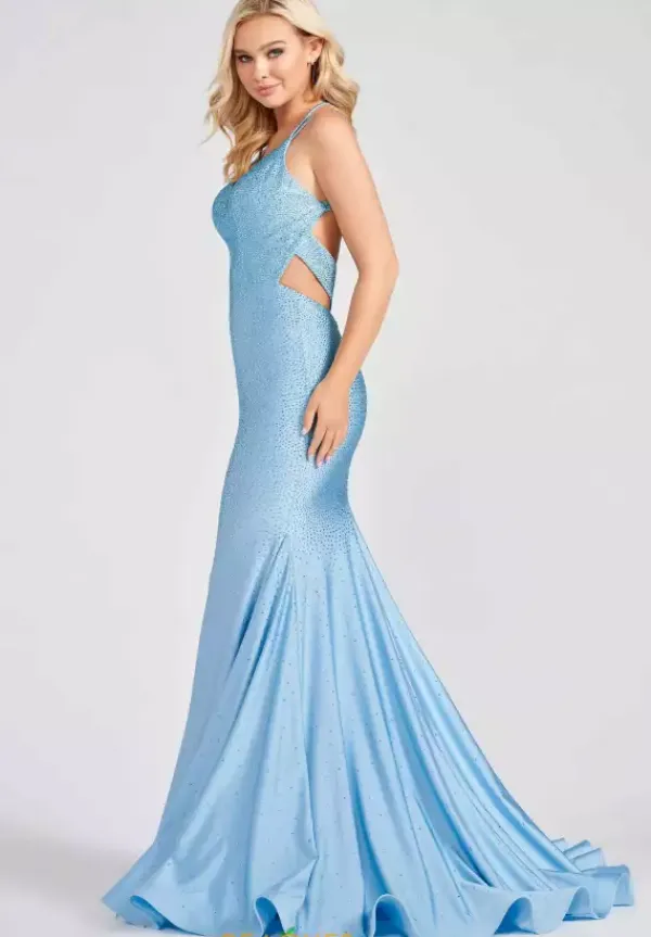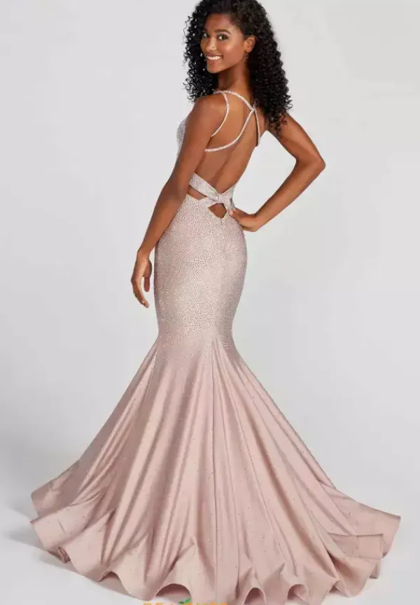 Show off your figure and rock this gorgeous Ellie Wilde fitted dress EW122001. This jersey long dress is adorn in heat presses tone on tone rhinestones that give it the perfect amount of sparkle. The v neckline showcases dual thin straps that criss cross over each other on your open low back. The dress is complete with a long fabulous train.
