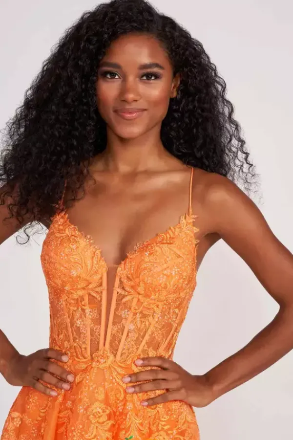 Be bold and fashionable in vibrant A line dress EW34036 by Ellie Wilde. Flatter your figure effortlessly with a fitted and trendy corset bodice that can be cinched and adjusted to your liking with the adjustable lace up closure. The fitted bodice flaunts a dramatic plunging V neckline along with stunning lace and applique details that create a stunning transition onto the top of the voluminous sparkling tulle skirt.