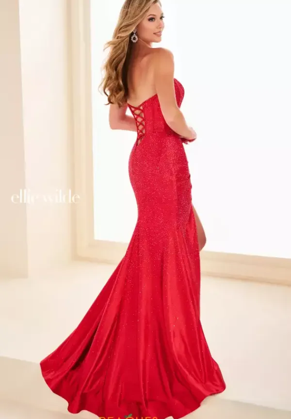 Dazzle beautifully in this sparkling Ellie Wilde long dress style EW37063 embellished completely with heat set stones. This scintillating gown showcases a strapless corset bodice with a scoop neckline and low lace up tie back. The long slim skirt has a high front side slit with zipper to adjust how high and a back sweep train.