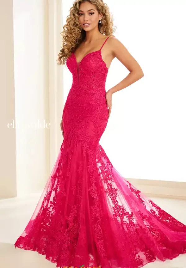Leave the crowd speechless when they see you wearing this glamorous long fitted dress by Ellie Wilde style EW37209. Showcasing a plugging v neckline that cascades to a tasteful corset that’s detailed in delicate applique, ravishing beadwork, and glitter tulle. The corset lace up shows off your appealing open back. This skirt is made in tulle, the train will leave a long lasting impression.