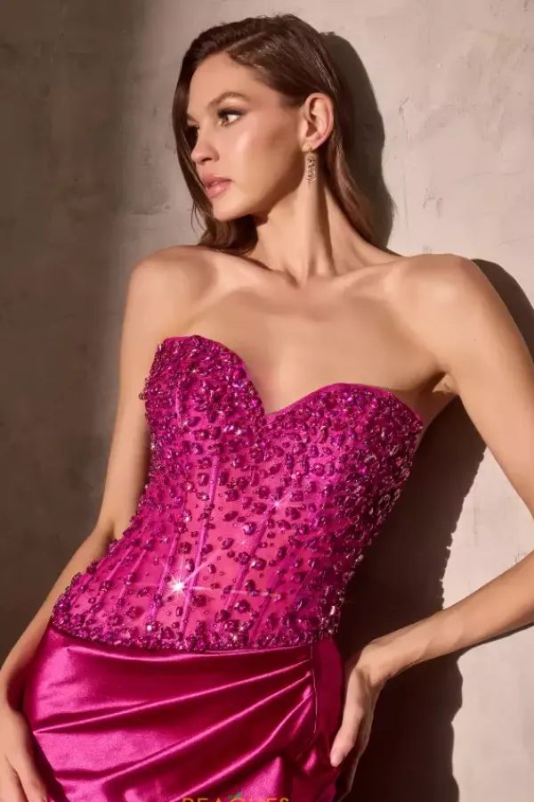 This electrifying 2026 La Divine by Cinderella prom dress style 106CC0447 combines intriguing with enticing. The body con structured corset dress boasts color matching crystals that complement the gleaming non beaded ruched satin high rise slit skirt. This glamorous dress is completed with a discreet zipper closure.