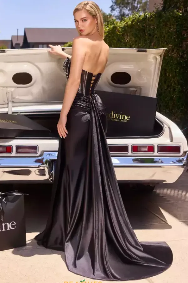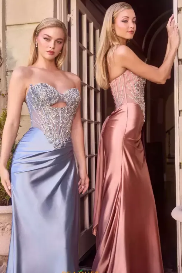 Amp up the sexy factor with this enticing La Divine by Cinderella prom dress style 106KV1135. The strapless corset bodice features a seductive horizontal keyhole cutout while the flowy satin skirt boasts flattering ruching on the front and back. Various sizes of crystal accents encrust the bodice intricately.