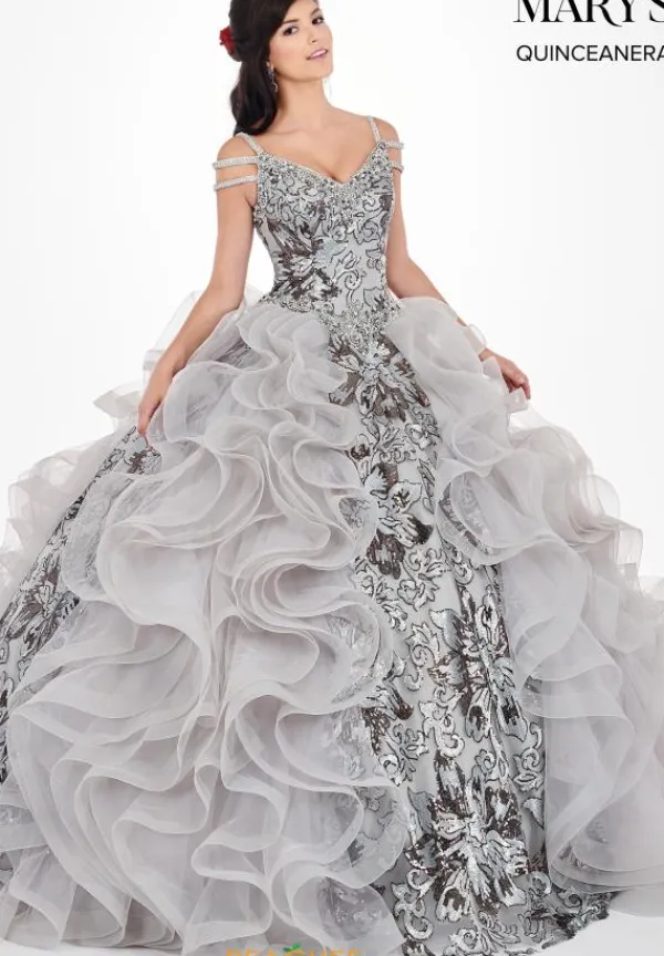 We are loving this one of a kind Mary’s dress style MQ2065. This unique dress showcases a sweetheart neckline and straps that give it an off the shoulder illusion. A fitted bodice is adorned with unique sequins patterns, before leading into a lace up closure with a cut out in the back. This amazing ensemble flares out into a full ball gown skirt with ruffled tulle, as well as the continued sequin pattern from the bodice. Find more show stopping dresses at Peaches Boutique.