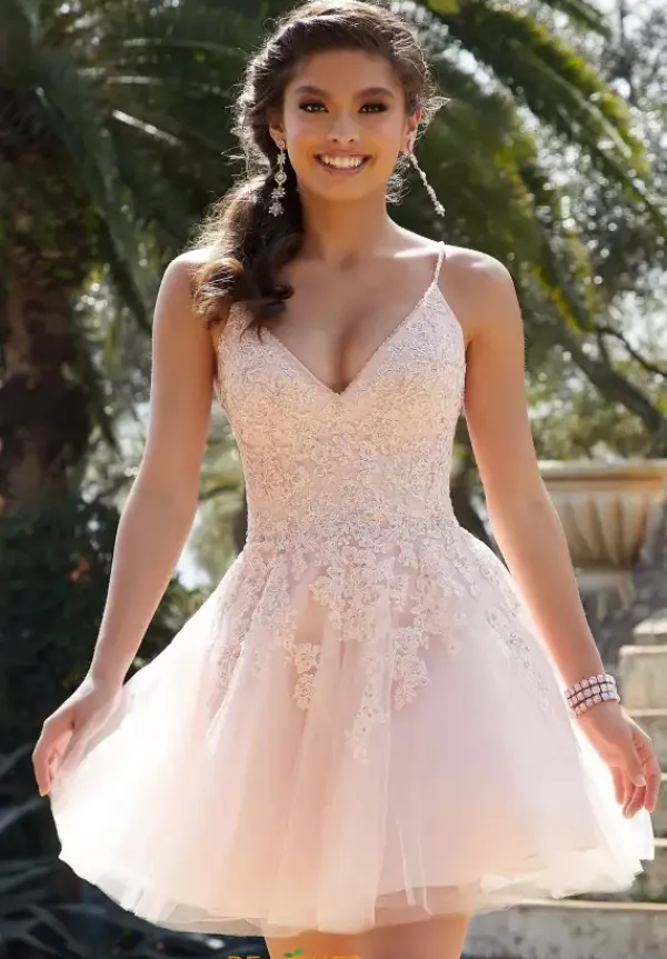 Stand out at your upcoming dance in this ultra chic Morilee short dress 9515. Leaving the audience in awe as you show off the dazzling lacey dress featuring a modest v cut neckline embellished beautifully all throughout. Showcasing the a-line styled gown which is made in a classy tulle material closed off with a laceup detailing.