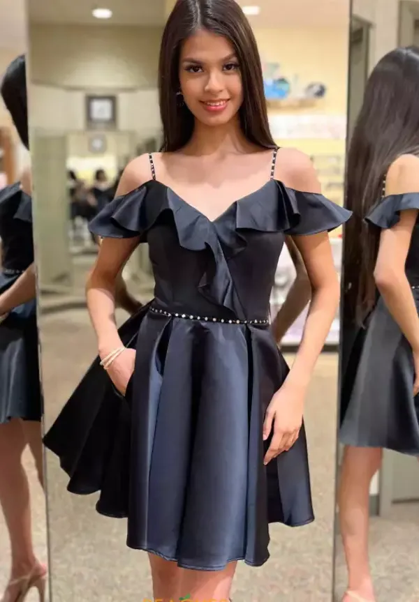 Strike a pose in this dazzling short dress 9536 by Morilee. Showcasing an exceptional off the shoulder ruffled neckline and beautifully beaded straps. Made with satin, this a line silhouette will give you the most flattering and charismatic appearance. A beaded belt at the waist brings this look together seductively.