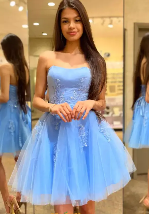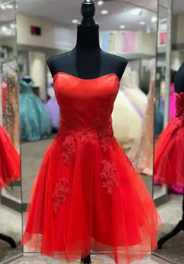 Short and sweet is this Morilee damas dress 9575. This dress has a satin bodice with a scoop style neckline. The back features adjustable lace up to give you that snug fit. Lace appliques embellish the bodice of the dress and continue to overlay where the skirt meets the top. Scatters of those matching lace appliques peek through the a line tulle skirt.