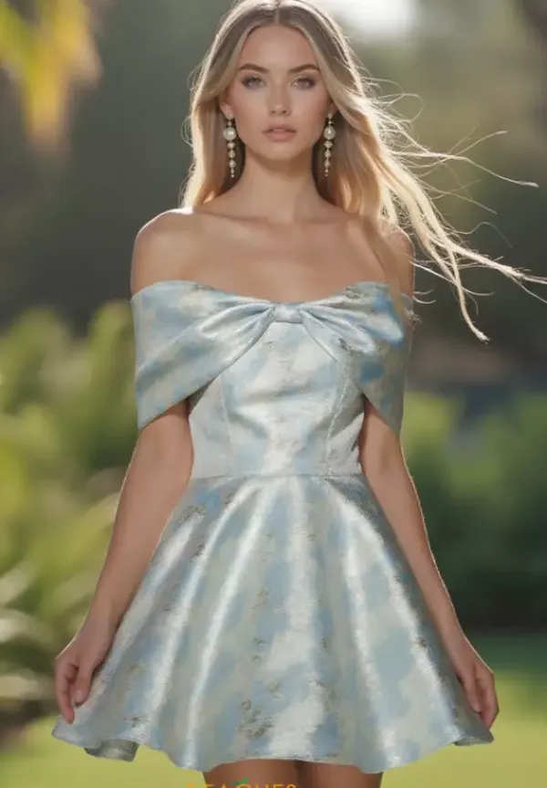 Show the crowd your fashion side as you walk into your event wearing this dress designed by Alyce Paris, style 30046. This short A line dress is adorned in captivating jacquard material featuring an off the shoulder scoop neckline leading to cap sleeves to achieve that stylish look. You cannot go wrong with a dress with pockets, perfect for dancing your night away.