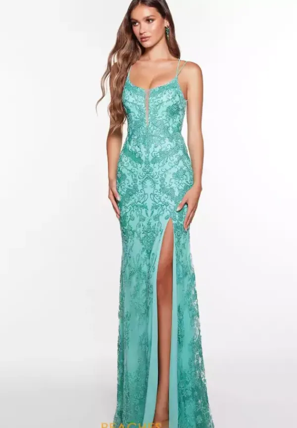 Captivate the crowd while wearing this ravishing Alyce Paris dress 61407. Gorgeous fitted dress displays a scoop neckline with double straps on both sides that make their way along the back, creating a lovely corset lace up. Garnished in glitter details, this stunning dress is also complemented by a lovely high slit for a more dramatic feel.