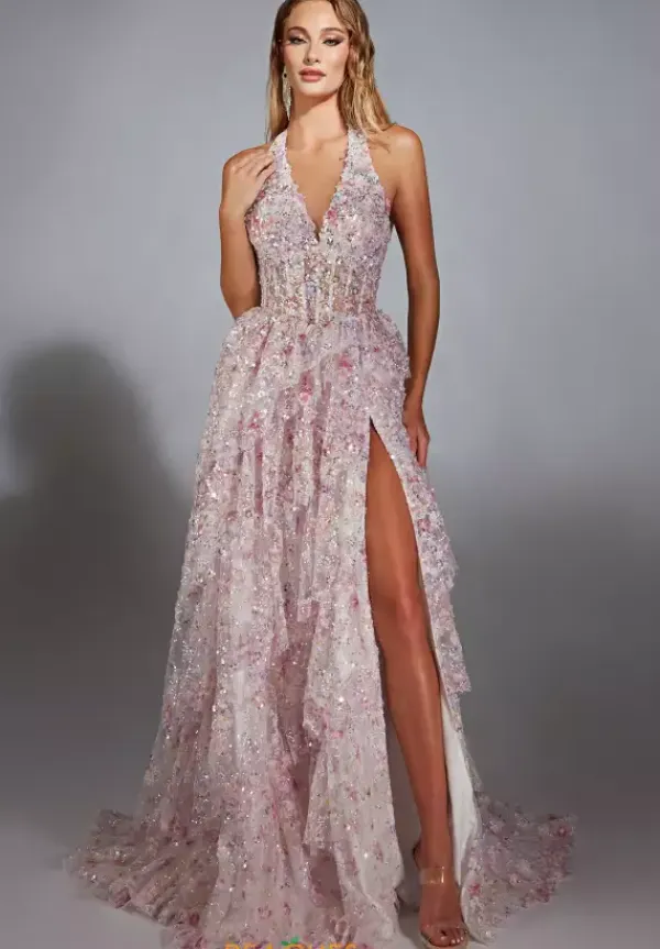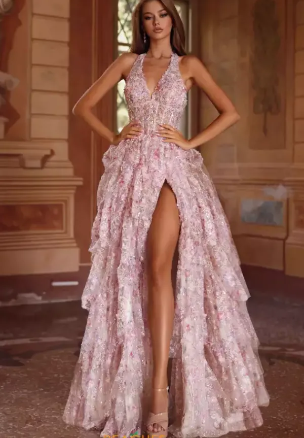 Feel like you just step foot off the runway in this extravagant long dress by Alyce Paris, style 61740. Featuring an A line silhouette with a modest halter v neckline. This ensemble is fully embellished with glistening beadwork ad dazzling sequins, thats sewn in an intricate pattern. A thigh high slit is the final touch of this masterpiece.