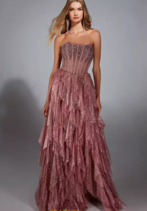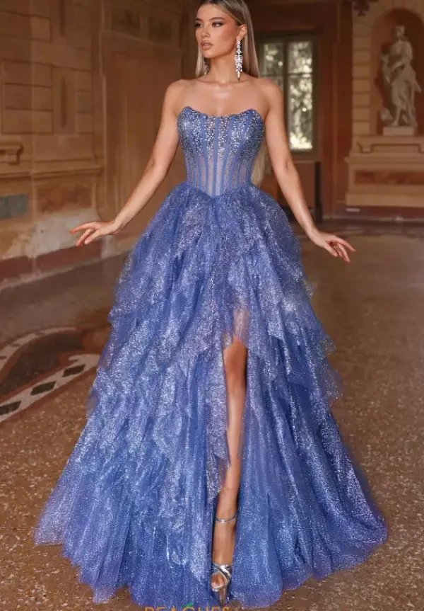 Sparkle all night long in this fabulous long dress by Alyce Paris, style 61762. Featuring an a-line silhouette with a strapless scoop neckline. The corset bodice is fully embellished with glistening beadwork. The gorgeous flowy skirt is made out of a glittered tulle material. A thigh high slit is the final touch.