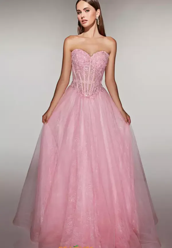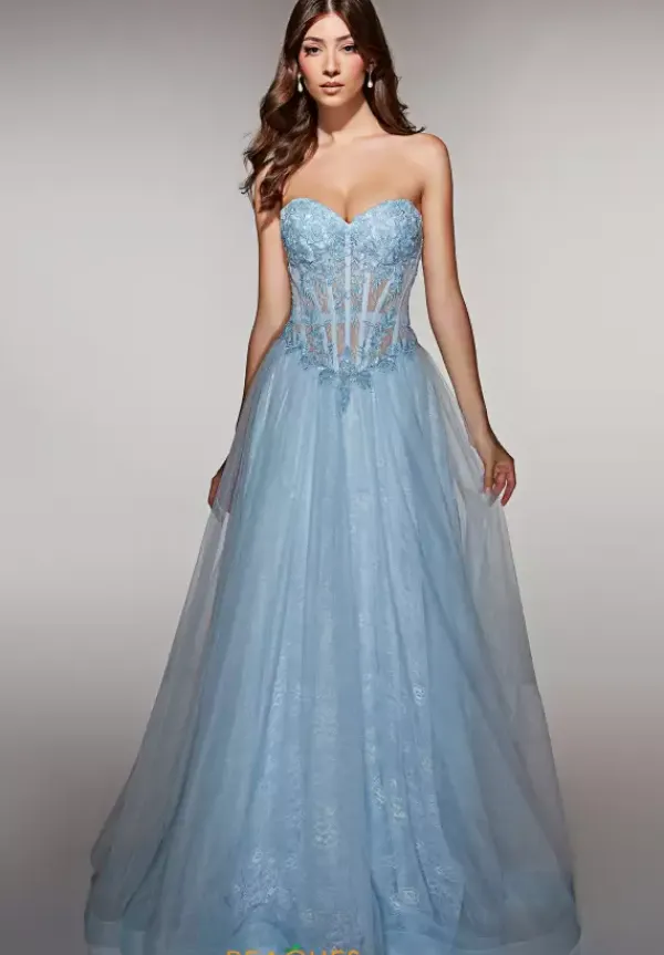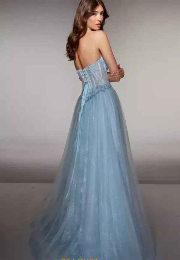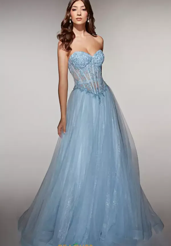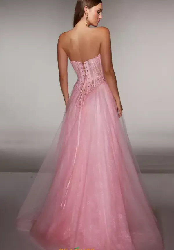 Look like a real life princess in this gorgeous long A line gown by Alyce Paris style number 61984. This beautiful dress features a classic strapless sweetheart neckline with delicate floral applique and a semi sheer corset bodice with exposed boning. The flowing skirt is made out of a lovely sparkling tulle with lace detailing.