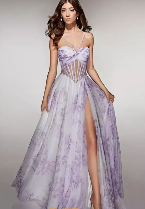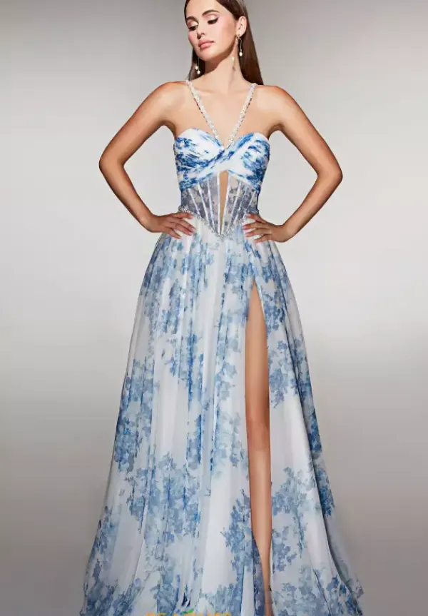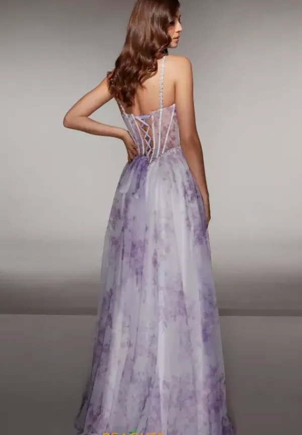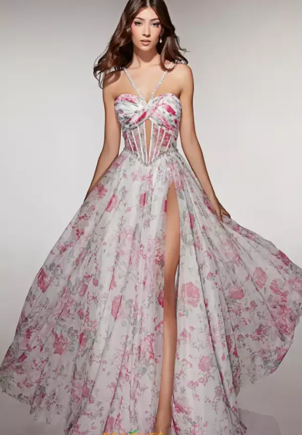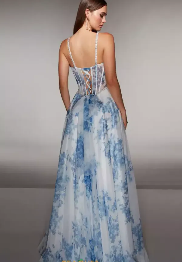 Have all eyes on you at any event you attend when you wear this long A line dress by Alyce Paris style number 61994. This beautiful dress features a halter V neckline that cascades into a corset with lace up to hug your figure. The dress has beautiful beading and pearls that make it stand out and the thigh high slit adds the perfect final touch.
