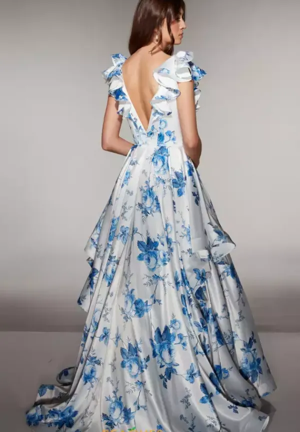 Turn heads at your next social occasion in this stunning Alyce Paris long dress style 62001 made in a phenomenal blue and white floral print satin. This impeccable gown features a fitted bodice with a deep V neckline, ruffled cap sleeves and low V back. The long, a line skirt has hip pockets, side ruffle tiers and back sweep train.