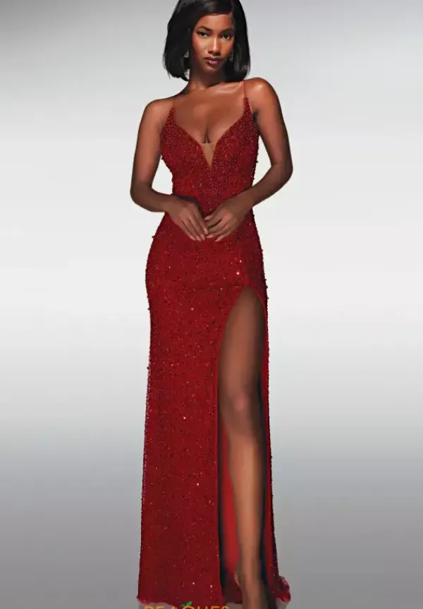 Exude timeless elegance in this long fitted dress by Alyce Paris, style 62004. This classy ensemble features a plunging V neck line with a touch of mesh in the center for modesty. The dainty straps lead into a flattering corset lace up and open back. Adorned in stunning beadwork, ensuring you catch every light. Show off your lengthy legs with a thigh high slit.
