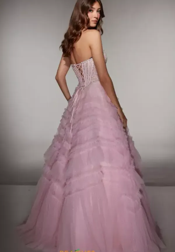 Leave everyone stunned when you wear this lovely long A line dress designed by Alyce PAris, style 62007. Featuring a strapless sweetheart neckline with a corset and lace up. This voluminous skirt leads into a beautiful sweep train. Adorned in lace, pearls and net material, making you picture perfect.