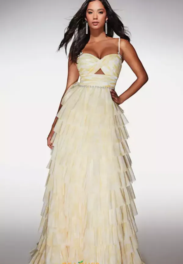 Turn heads at prom in this eye catching Alcye Paris long dress style 62018 made in printed soft mesh shades. The phenomenal dress features a fitted bodice with front cut out with a sweetheart neckline, spaghetti straps, pearl beaded waist embellishments and low back. The long a line skirt has ruffle tier layers for fullness and a back sweep train.