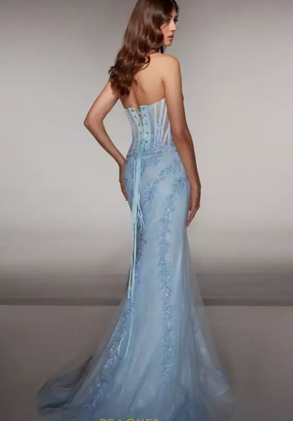 Look sleek and elegant in this gorgeous long fitted gown by Alyce Paris style number 62036. This show stopping dress features a classic strapless scoop neckline with a structured corset bodice and exposed boning. The entire dress is embellished in delicate lace and dainty floral applique as well as shimmering beadwork.