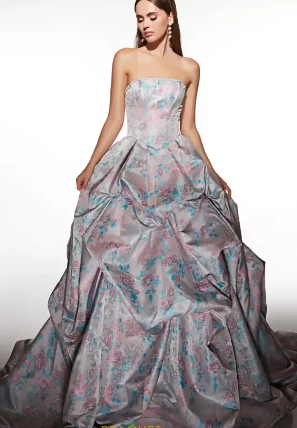 Look like modern royalty in this captivating Alyce Paris patterned dress style 62039. Glistening beads dazzle across the strapless neckline while the glowing patterned jacquard fabric exudes elegance all the way down to the long sweep train of the dramatic textured voluminous a-line skirt. Behind the bodice features a lace up closure.