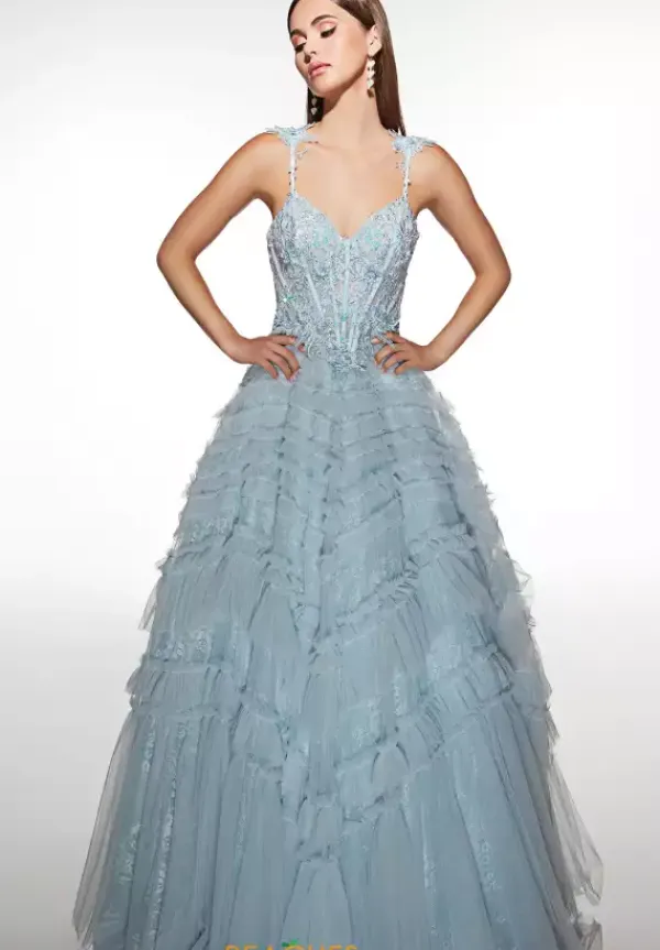 Glamorous texture and radiance adorn this bright Alyce Paris corset a-line prom dress style 62058. Floral and vine appliques encrust the adjustable corset bodice and exude an impeccable shimmer against the non beaded net closed skirt. Elegant ruffled texture is displayed in tiers throughout the sweep length skirt.