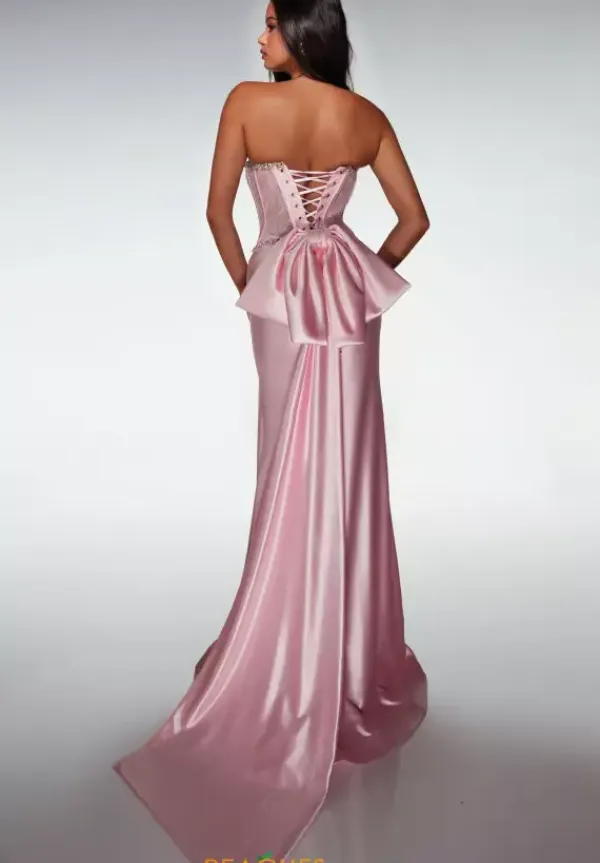 Look like wealth in this flamboyant Alyce Paris fitted satin prom dress style 62089. The strapless sweetheart neckline of the elegant adjustable lace bodice is lined in striking stone accents that shimmer across the top and bottom of the corset. The glossy satin skirt features a sexy high slit and glowing sweep train. The bottom of the lace closure displays an oversized wilted bow embellishment.