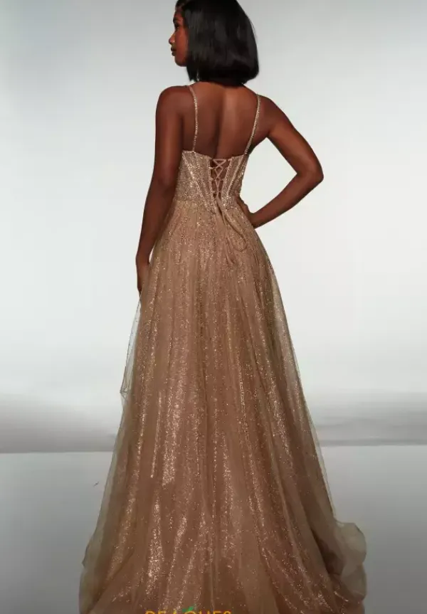 Shimmer, sparkle and radiate from all angles when you wear this Alyce Paris a line dress. Style 62093 details are out of this world, this a v neckline bodice and thin beaded straps. The rhinestone and heat set hot stone shimmer effortlessly and adorn the bodice. The glitter tulle skirt continues that detail down it.